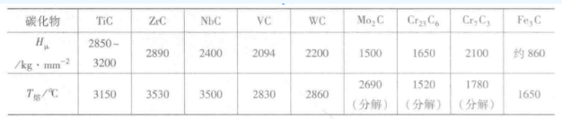 碳化物具有脆性、高熔点和高硬度等特点,各种碳化物的显微硬度及熔点见表。